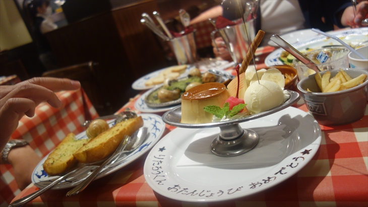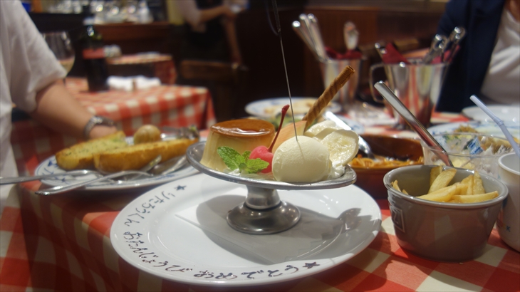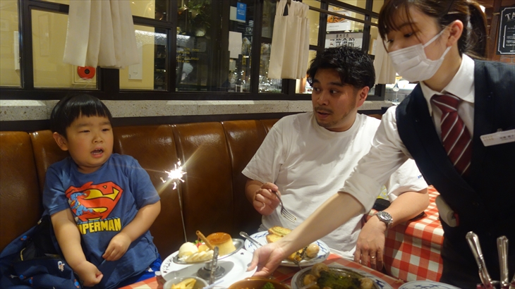 20時過ぎ、デザートタイムになり赤ワインボトルを追加すると同時に、利太朗くん用の花火パチパチのプリンアラモードでお祝いは盛り上がります。約3時間の三笠会館会食で利太朗くんの4歳誕生日をお祝いしました。