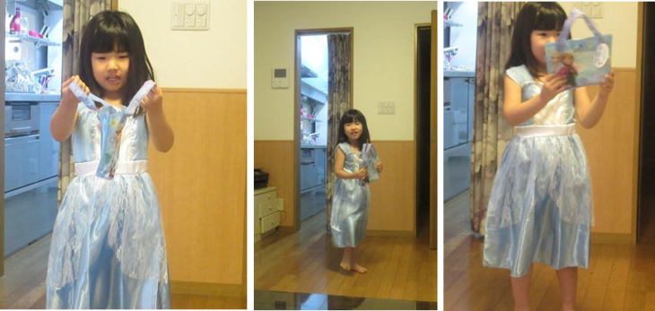 朝起きたら届いていたプレゼントに大喜び、さっそくお着換えしてエルザになって歌ってくれました。
