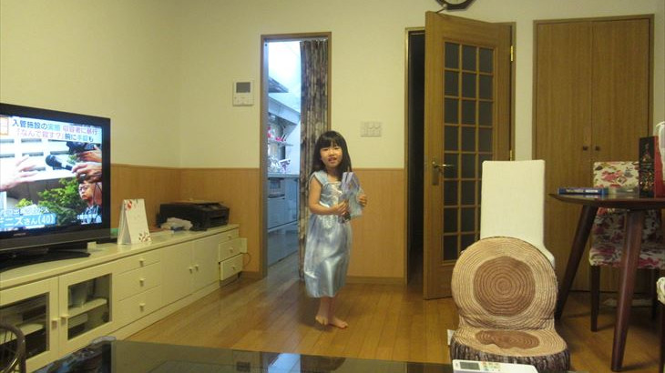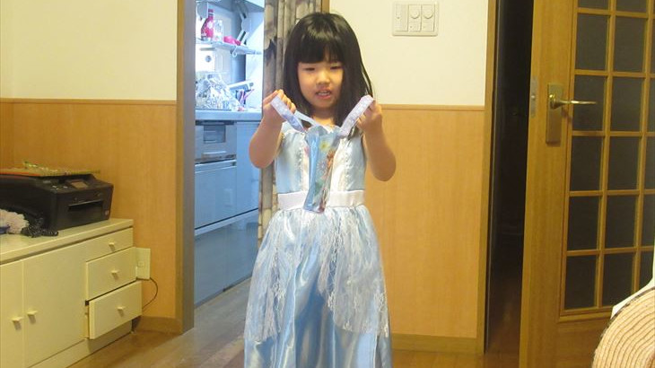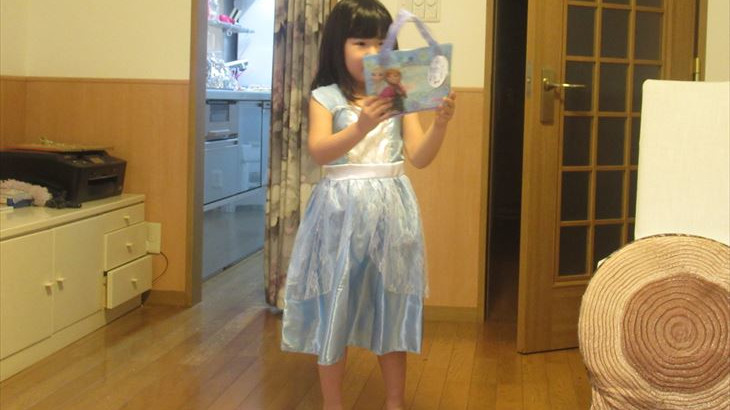 朝起きたら届いていたプレゼントに大喜び、さっそくお着換えしてエルザになって歌ってくれました。