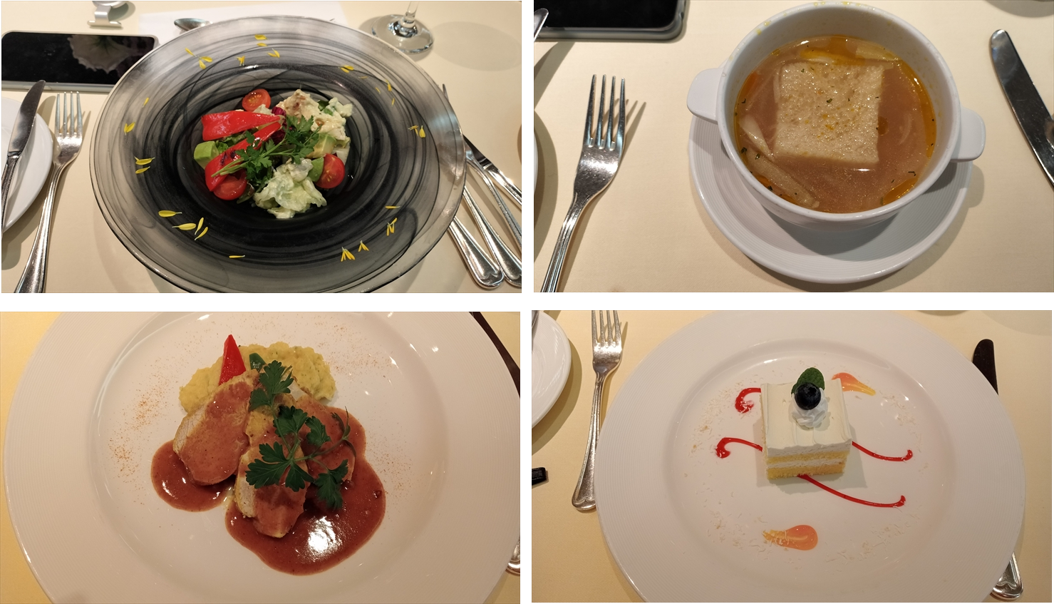 出航式も終え、初めての食事は5階の洋食、ランチからフルコースです。一人旅の女性3名とご夫婦1名のところに案内されました。最初はほとんど会話がなく、後半少しだけ話しました。