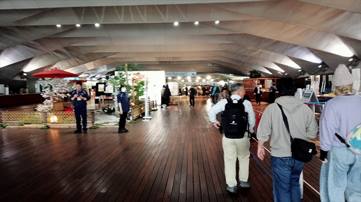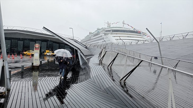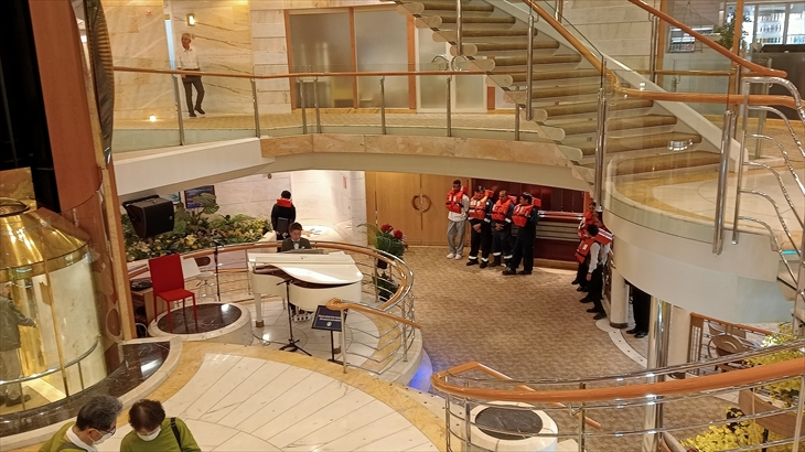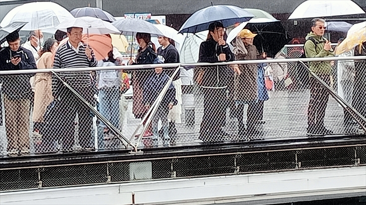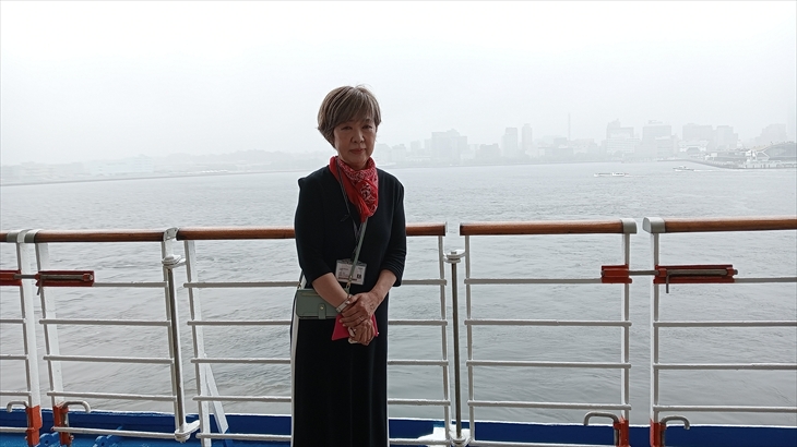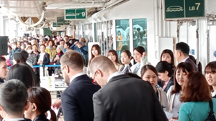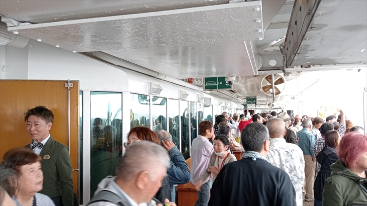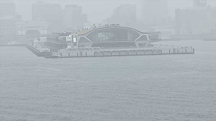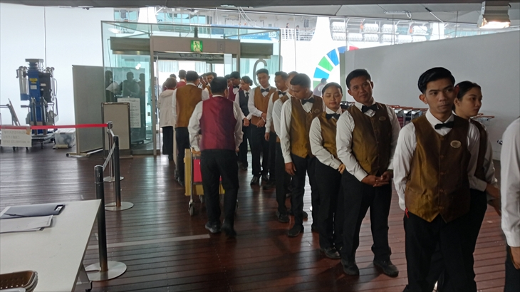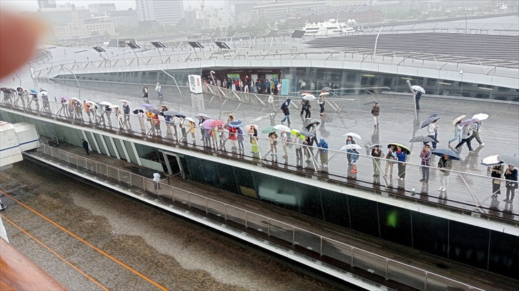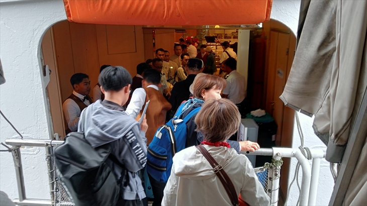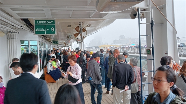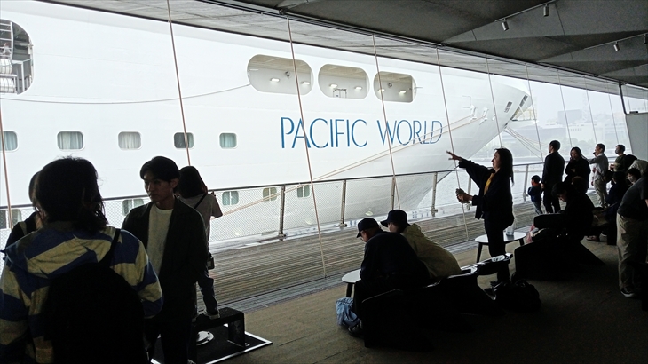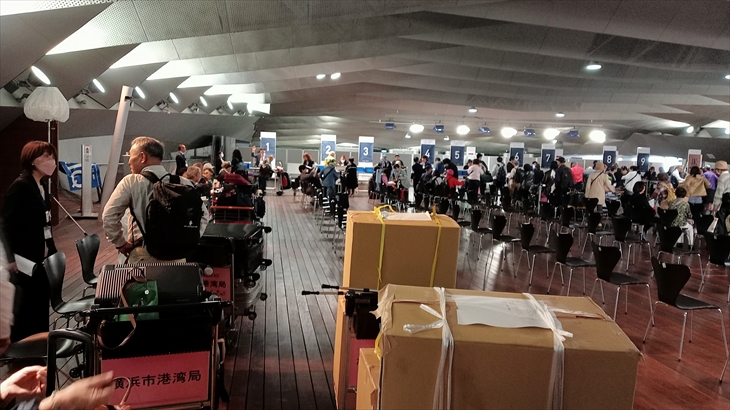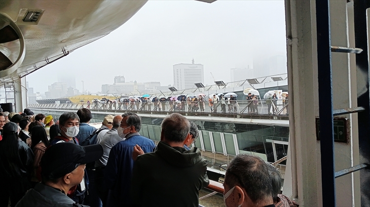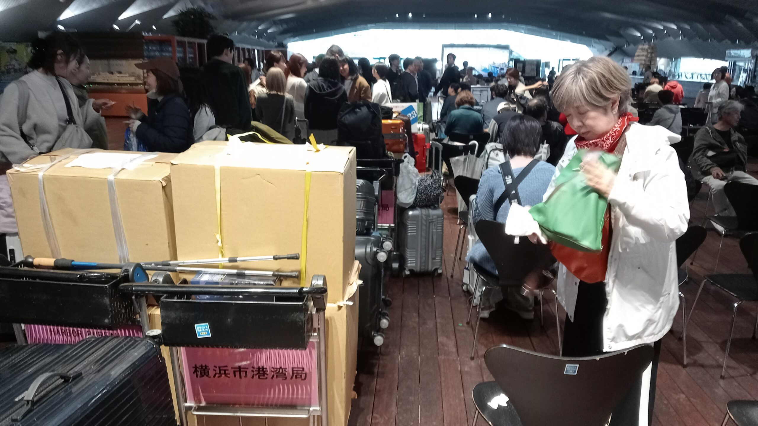 7時50分に出発、大桟橋で荷物を降ろし自宅へ向かったのが8時30分、電車で大桟橋に到着したのが9時20分ころでした。すでにチェックインは始まっていました。