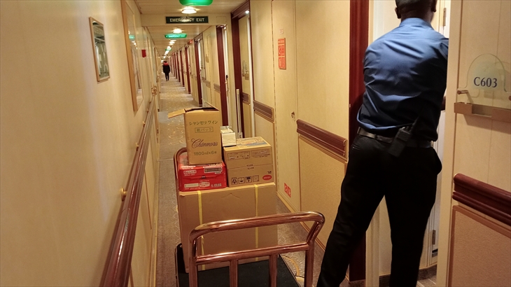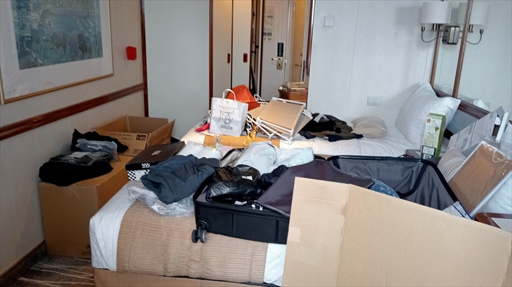 出航前日までは段ボール7箱とスーツケース大1つでしたが、自家用車で運べないことが判明し、段ボール5箱とスーツケース3箱でどうにか大桟橋まで運びました。