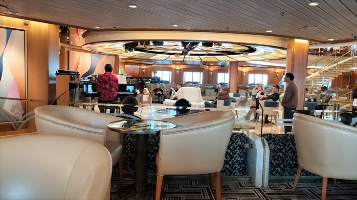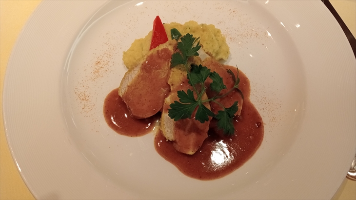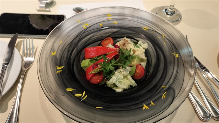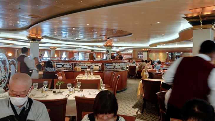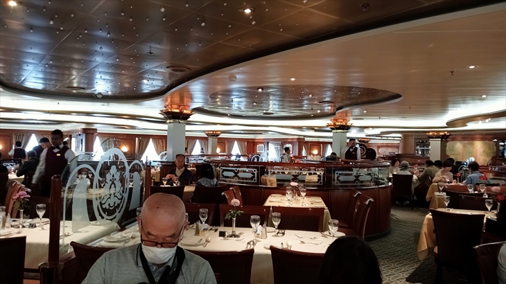 出航式も終え、初めての食事は5階の洋食、ランチからフルコースです。一人旅の女性3名とご夫婦1名のところに案内されました。最初はほとんど会話がなく、後半少しだけ話しました。