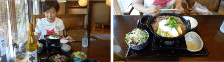 10時30分ころ律子さん小田原経由で仙石原に到着。先週運んだ荷物を片付け、近所の和食「遊繕」でランチ。白ワインですき焼き風とステーキのひつまぶし風を頂きました。綺麗なお店です。