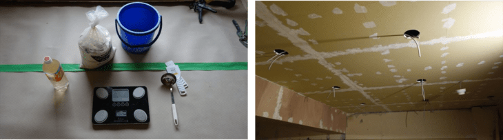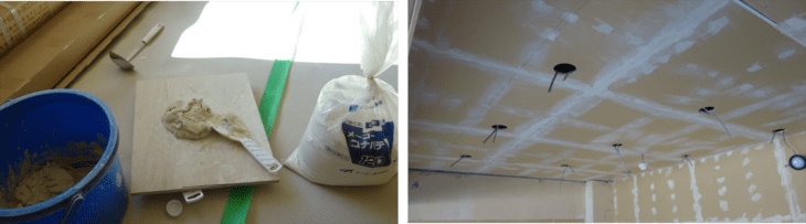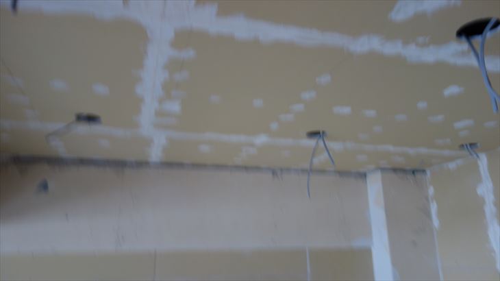 大きい隙間に家庭化学の壁パテ挿入作業を行い、14時ころ手配を午前中やりました。作業の順番はフォローリング→廻り縁・巾木(木製)→クロスが正しいということを本日知り、天井石膏ボードのパテ作業を行いました。1kg粉パテに0.5kgの水を加え攪拌してパテを作ります。2時間以内に作業しないとパテは固まってしまう。急げ・・・・