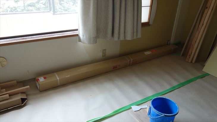 旧和室廻り縁を撤去したコンクリート溝を隠すために洋風の廻り縁を選定し、接着剤などの材料と廻り廻り縁の手配を行いました。