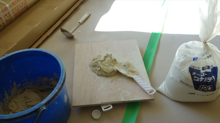 パテ材料を1kg作り、昨日の続きを行った。パテは乾燥すると固くなり使えなくなるので2時間以内に作業完了が必要。午前中、キッチン部分のパテ塗りを行いました。