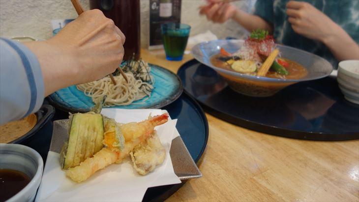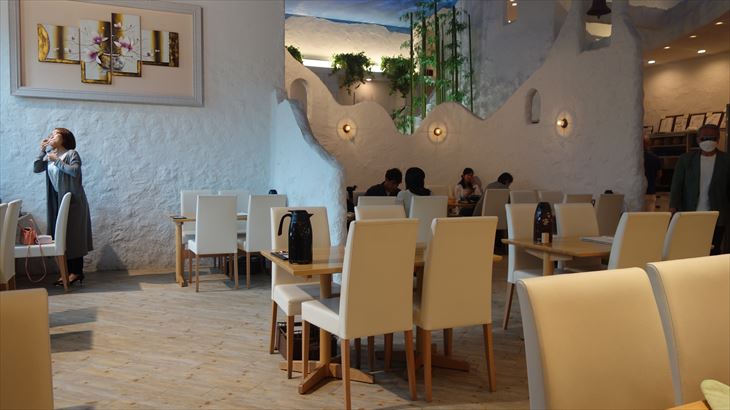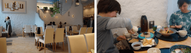 隣りにあるじねんじょ蕎麦「九十九」は仙石原で人気のお店です。休日などは1時間待ちが普通、今日待ち時間なしで入店できました。店内の様子は天井が高くギリシャ料理の雰囲気、お蕎麦屋さん特有の日本的な感じは全くありません。