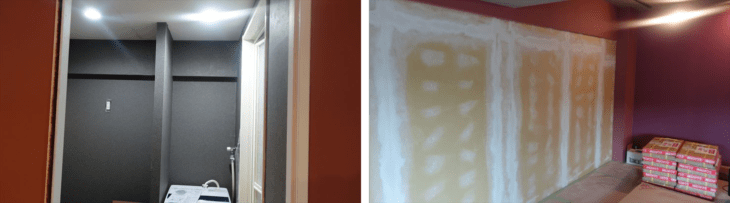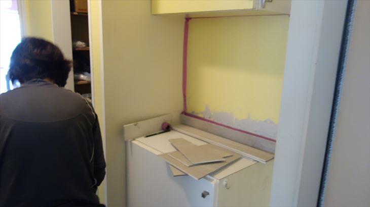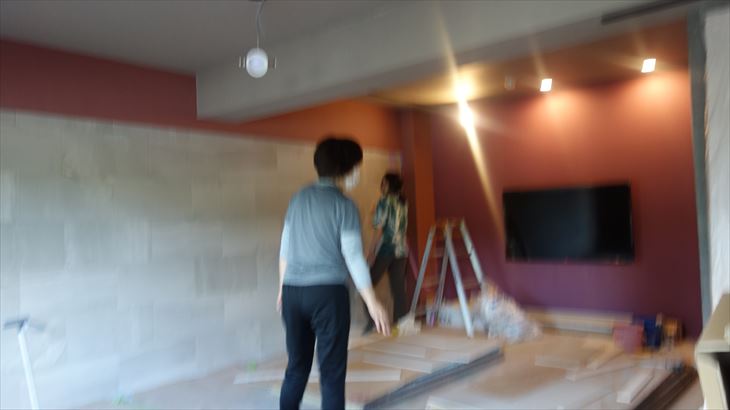いつも通り朝8時ころから作業開始。律子さんは寝ながら考えた昨日余ったエコカラットの有効活用作業、玄関に余ったエコカラットをサイズ調整しながら貼り付けました。それに加え、クロゼットの正面壁に破材アートを創作、素晴らしい出来栄えです。