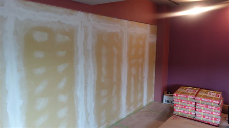 15時30分、ついに西側の壁一面にエコカラット貼り付けが完了しました。ビールで乾杯・・・・