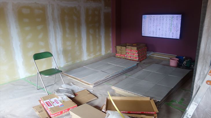 ランチの後、13時ころ作業再開。私は接着剤塗布と材料カット、律子さんは開梱・エコカラット配置・接着剤塗布、みゆチャンは接着剤塗布とエコカラット貼り付け・仕上げの確認。なんとなく決まったそれぞれの役割です。