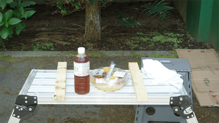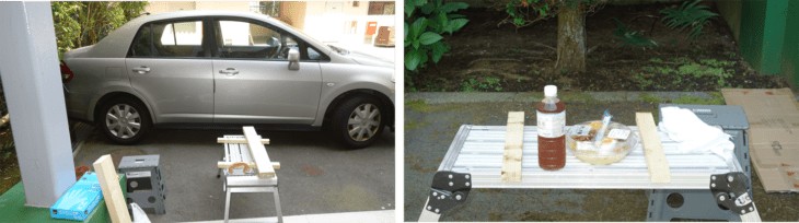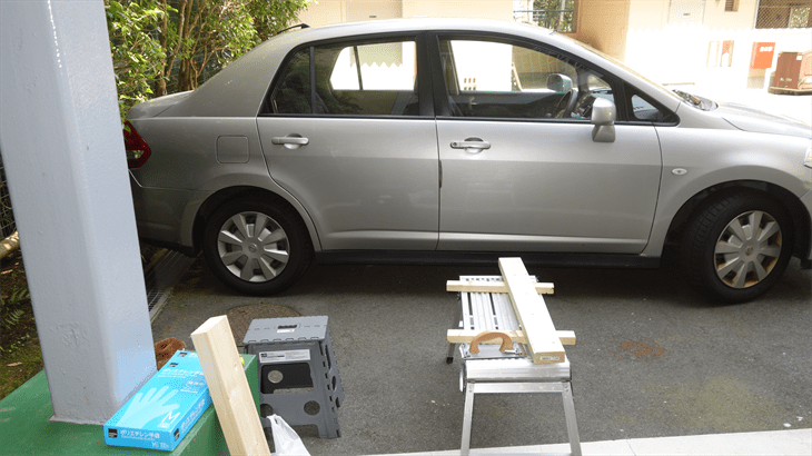 午前中ホームセンターで材料購入。木材のヤスリかけは粉じん発生するので部屋の中では無理、ベランダは熱いので駐車場の日陰で作業することにした。これが解放感があり心地よい・・・・
