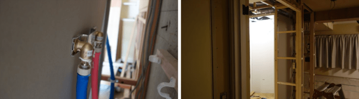 シャワー室の折り戸の入口と洗面所の床と壁は現物合わせでシャワー室の位置位置決めに苦労しました。検討の結果、折り戸左側の壁の誤差5mm。スペーサでその誤差を吸収することにしました。