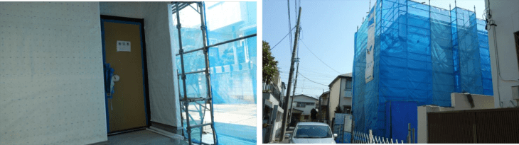 元住吉、玄関ドアが設置され鍵がかかっています。今後は職人さんがいるときでないと進捗確認できませんね。