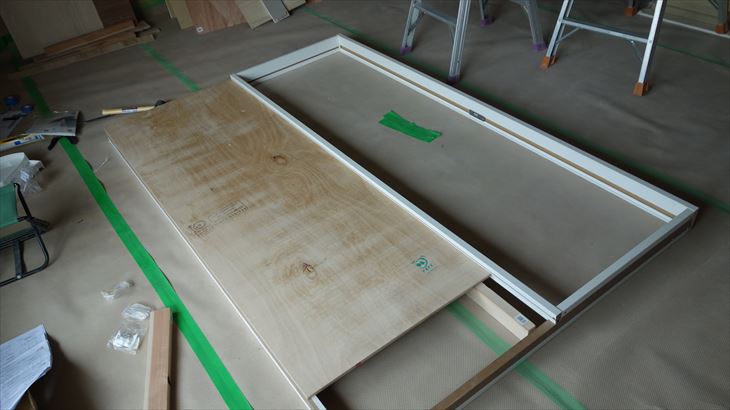 午前中、洗面所引き戸用合板の切断と位置合わせ作業。洗面所の寸法測定を行い、ホームセンターに材料調達に行きました。