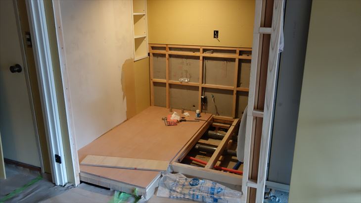購入した合板に配管用の穴などの加工を施し仮置き。シャワー室ユニットの入口部もうまく結合できました。本番固定すれば完了です。来週シャワー室水栓を取付け水漏れが無いことを確認して本番固定の予定です。