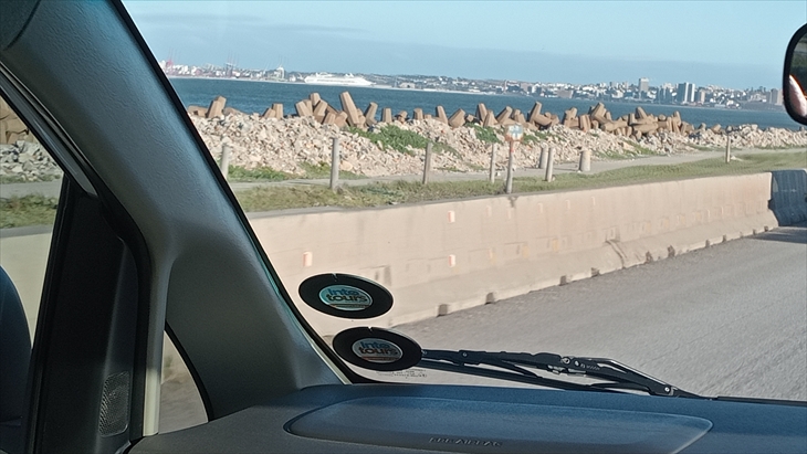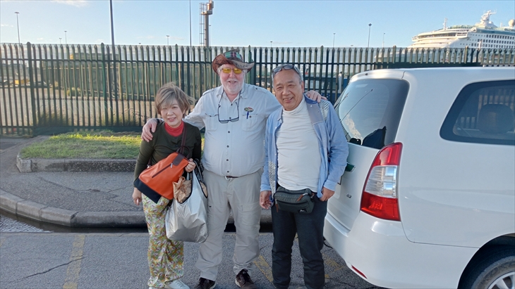ガイドさんの運転するアウトバーンではスピードはゆうに120kmは常に超え、で怖かった!遠くに見えていた船があっという間に近づきました。港近くにはスラム化した地帯もあり、この国の影も見て取れました。ポートエリザベスの港に無事戻ったのは16時10分。記念写真を撮影してサファリツアーは終了しました。取ってくれたのは、たまたま港にいた昨日のガイドさん。また会えました。そして昨日と今日のガイドさんが握手。楽しく解散となりました。