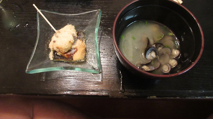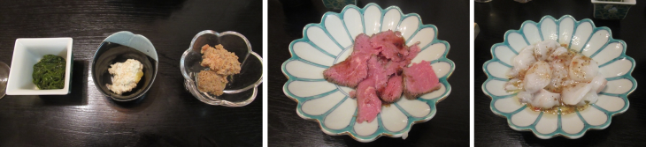 白ワインと一緒に頂いた前菜3品(モズク、白和え、たらこの煮つけ)は非常に美味しかった~。多分サービスと思われるローストビーフとタコのお刺身が前菜の次にでてきました。