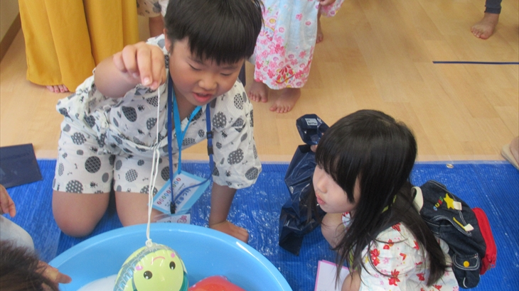 10時から1時間20分は園内の各クラスに用意されたお遊びコーナでお祭り気分を味わいます。早速、1階のヨーヨーコーナで魚釣りを行い、となりのクラスでボウリングをやりました。