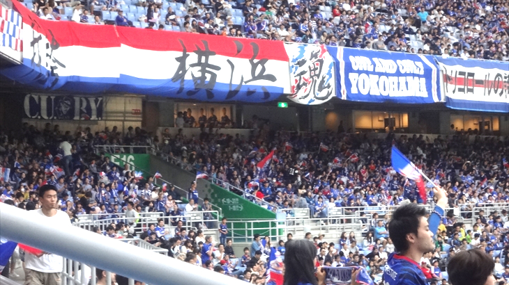 試合開始(18:00)に少し時間があったのでマリノスフラッグがはためく応援団シート付近に行って見ました。そこは別世界、試合前なのに皆、ピョンピョン跳ね上がり歌っており大盛り上がり。