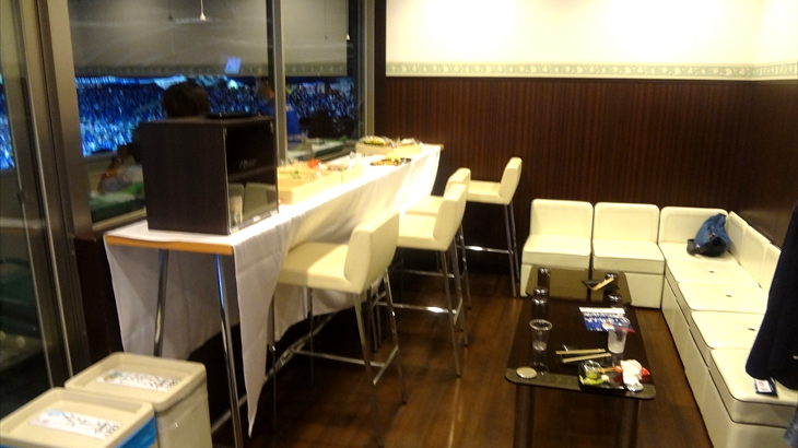 特別室(テラスボックス)は8畳くらいの部屋に冷蔵庫、ソワー、カウンター、テレビがあり軽食とワインボトルが準備されてます。ガラス扉を開けるとすぐ屋外の特別室専用スタンド席があり、一般席の近くなので臨場感も味わえます。