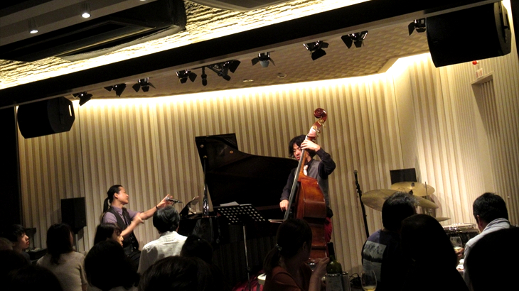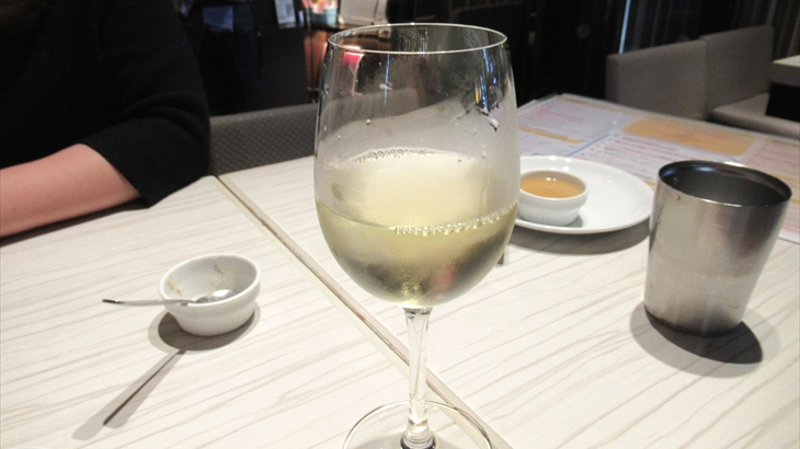 窓際の席に案内されるとスープみたいなお通しが登場、白グラスワインと生ハムとサラミの盛り合わせを注文し軽く頂いていると、生バンドの演奏がはじまりました。狭い座席スペースで満員なので少しうるさいという感じ。また、座席を詰め込んでいるので2人のお客様は相席になる方が多かったようです。
