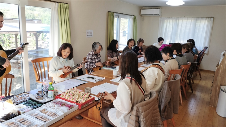 食事がひと段落すると、ウクレレとヨッシーさんのギターが登場!全員で大合唱が始まり、自然と手拍子や笑顔があふれます。