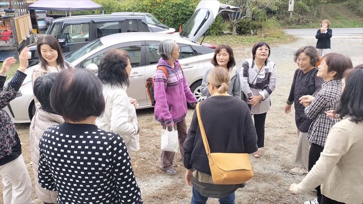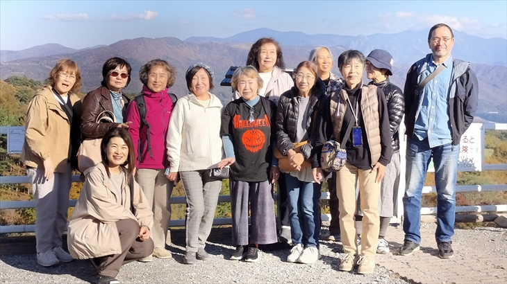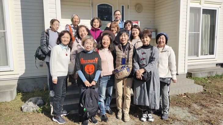 10時出発をめざして準備を整え、ペンション前で全員そろって記念写真をパチリ。笑顔いっぱいの集合写真を撮ったあと、3台の車に分乗して元気に出発しました。車の中では、ピースボート仲間とのおしゃべりが弾み、笑い声が絶えません。