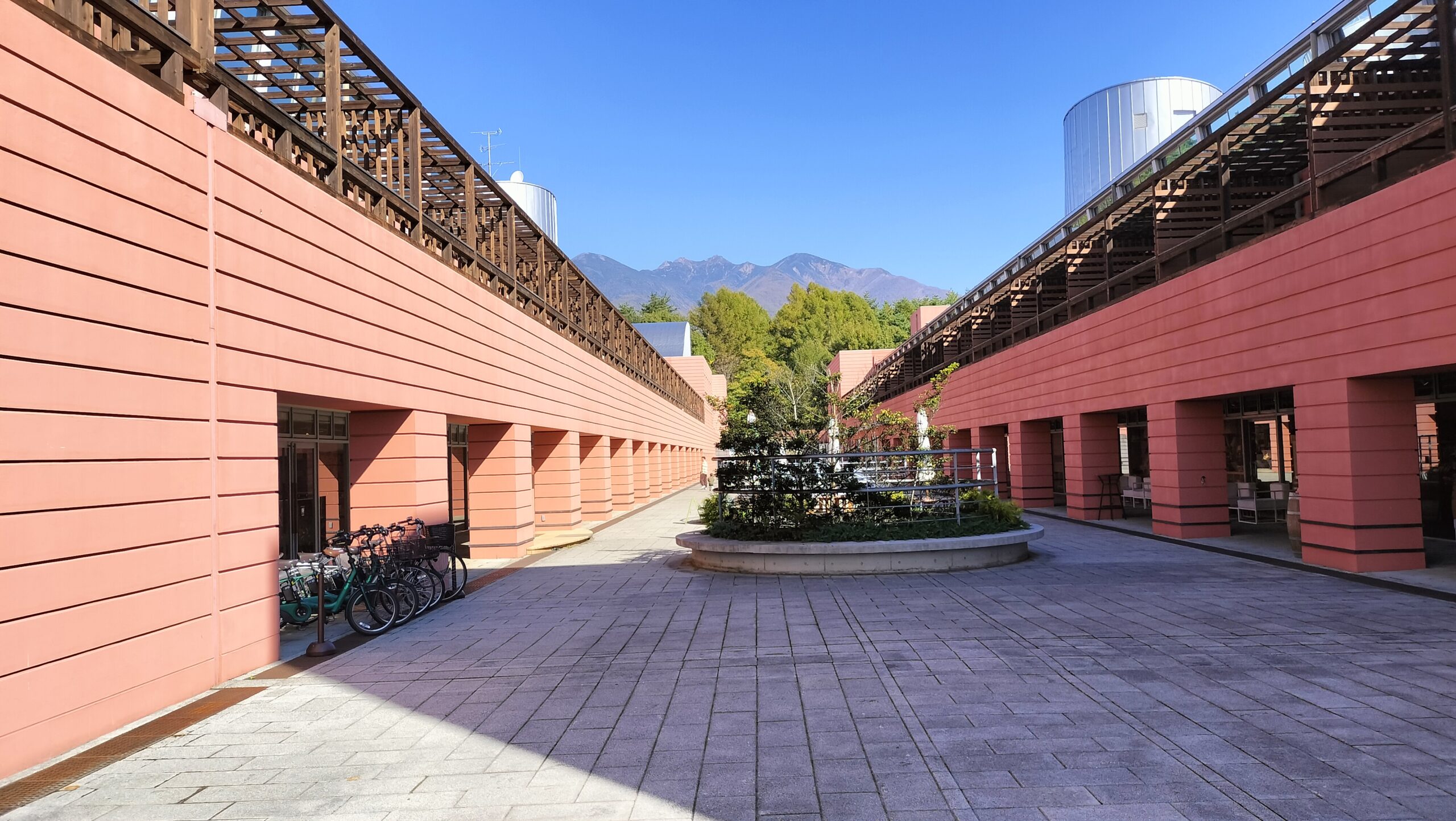 敷地内を歩くと、まるで本当にヨーロッパの街を旅しているような気分に。ストリートの先には、澄んだ空の下に南アルプス連峰がくっきりと見え、その絶景にみんな感嘆の声を上げていました。青空と山並み、そしてどこを撮っても“インスタ映え”間違いなしの一枚になりました。
