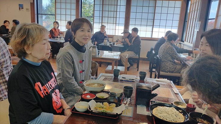 みんなのお目当ては、山梨名物の「ほうとう」と「鳥もつ煮」。ところが、人気の鳥もつ煮はB級グルメとして有名になっただけあり、なんと4名分で品切れ!ちょっと残念そうな声も上がりましたが、その代わりに馬刺しを味わった方もいて、それぞれ大満足のランチになりました。