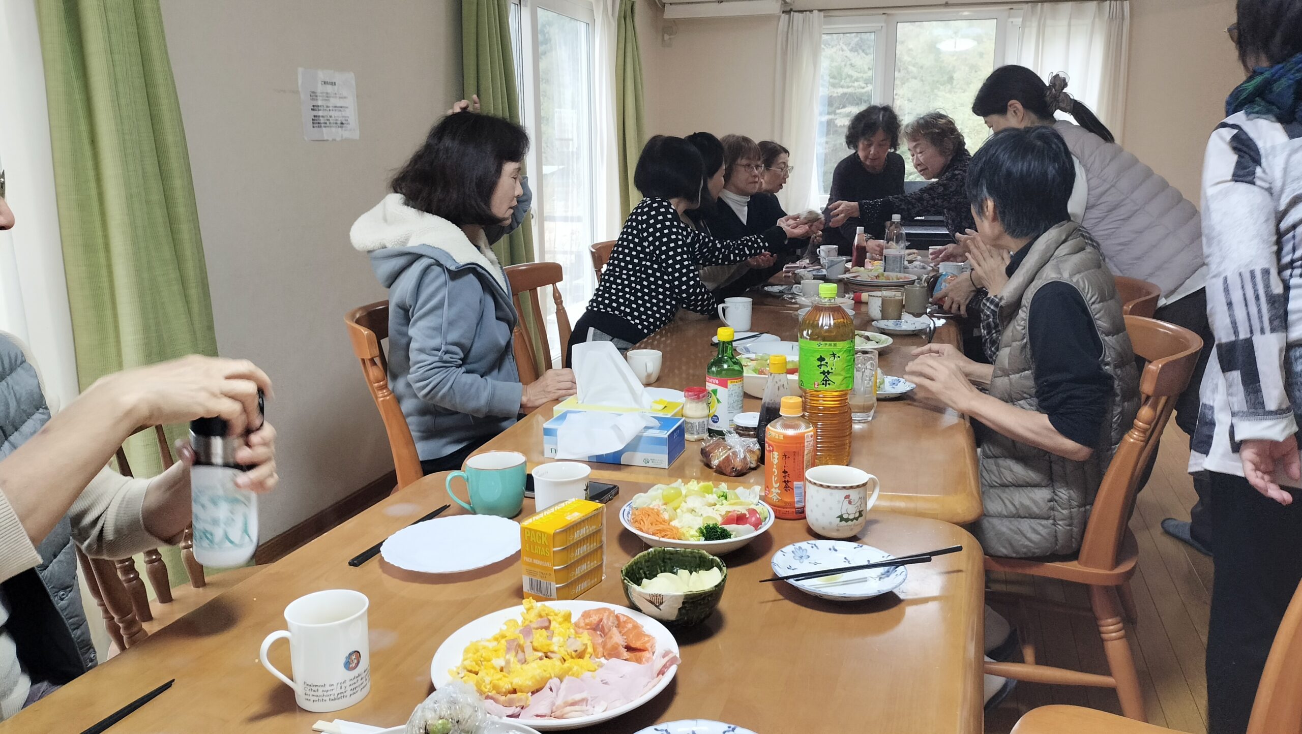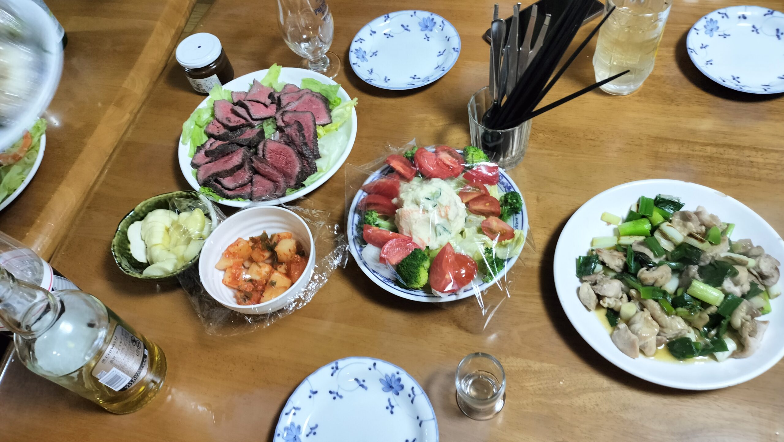 到着したのは18時少し前。ペンションではすでに夕食の準備がテキパキと進められていて、テーブルには、ヨッシーさんお手製のローストビーフとポテトサラダ、そしてアグネスさんが作った海鮮チヂミがずらり。
