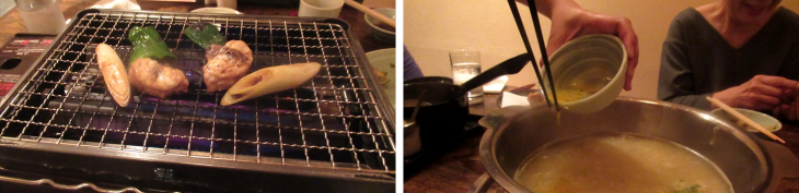 しばらくすると、ふぐ刺し(テッサ)、とても沢山の焼き河豚が登場。焼き河豚は隣りの中国人の4人前が間違えて運ばれたようで、即交換になりました。焼き河豚は何度もたれを絡ませてイワタニのコンロで焼くのがコツらしいです。