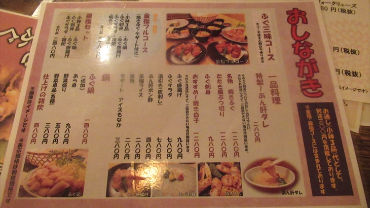 アラカルト注文もできるようですが、初めてなのでコースをお願いすることに、コースは「銀福セット:2480円」と「金福フルコース:3280円」があり、違いは焼き河豚の有無です。
