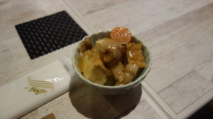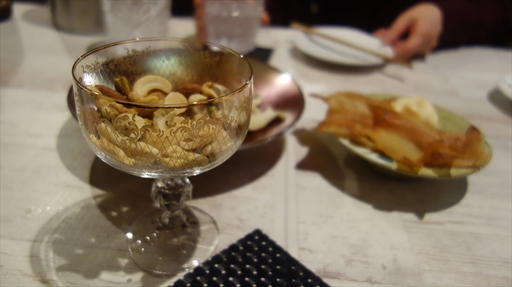 お通しは煮物、ブロッコリーは茹でただけなのに美味しい。エビチリにキノコの和え物を律子さん注文、ホッケを頂いたところで結構お腹一杯、飲み物は冷酒、忘れていた焼酎ボトルも出してくれました。最後のおつまみはピーナツとエイヒレ。エイヒレは厚みもなり最高に美味しかったです。