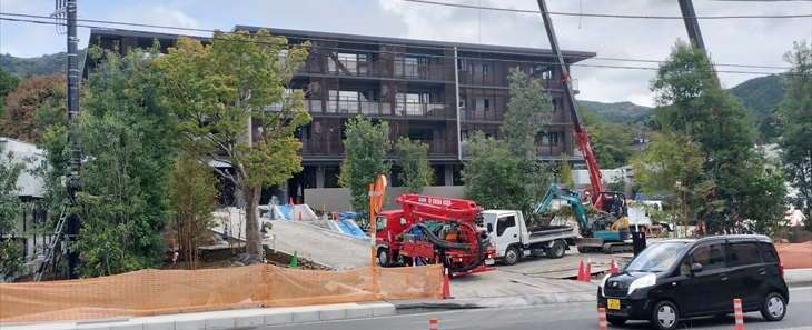 東急のホテルコンドミニアム12月15日開業する 「BLISSTIA(ブリスティア)箱根仙石原」の建物はほぼ完成し、エントランス付近の工事が行われていました。