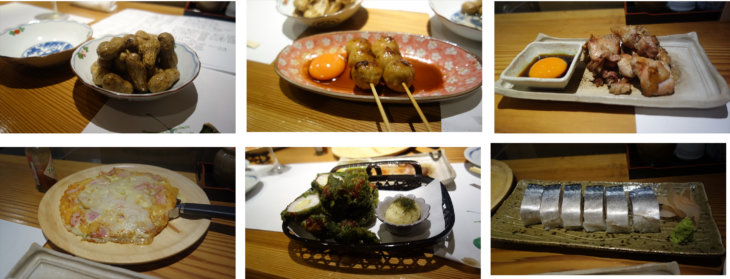 茹で落花生、つくね焼き、鳥の山椒焼き、ピザ風レンコン&ベーコン、ちくわの磯部揚げ、サバの押し寿司と盛りだくさん。どれも美味しく、人気店の理由がわかりました。このお店は特徴は炭焼きお肉とお蕎麦と思われるのでまた近々に行きたいです。