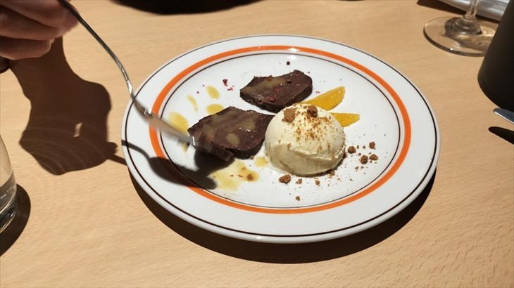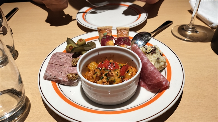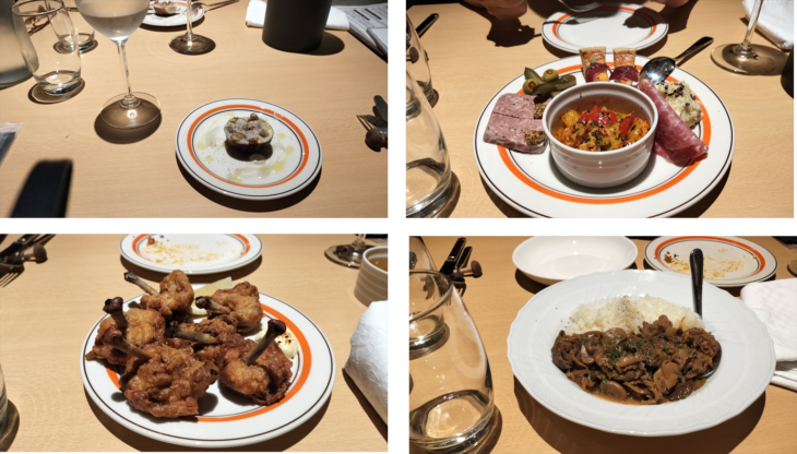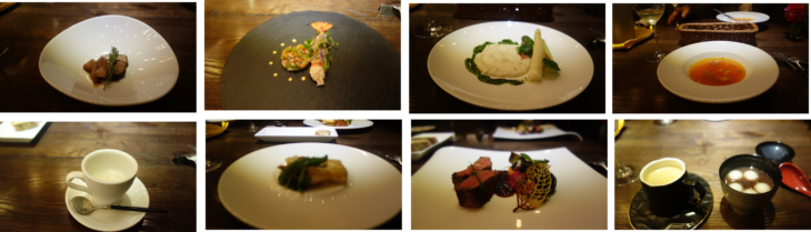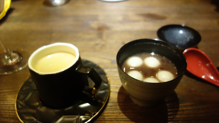 お店に到着すると「本日の夕食は予約の方のみです」との看板が掲げられています。コース料理の提案があったのでお願いしました。前菜3種が1種類づつ登場、お魚・お肉料理、最後のデザートはお汁粉でした。