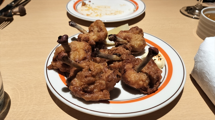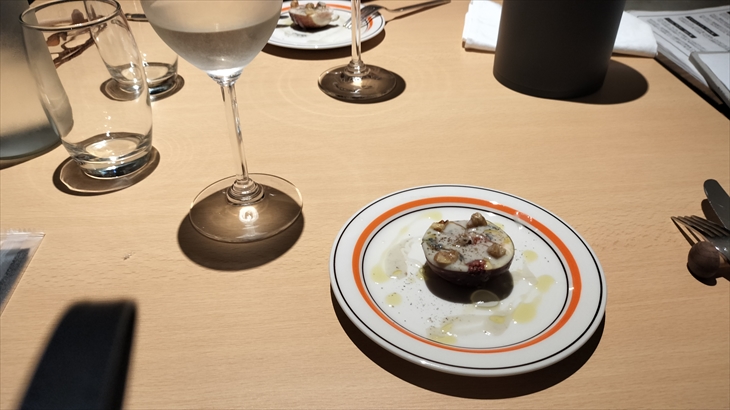 この日は当日の夕方に電話予約できたので初めて訪問したのは19時頃、イチジクの先付け、白ワインで乾杯しました。3種の前菜、唐揚げ、ビーフストロガノフ、デザートが本日のディナーでした。