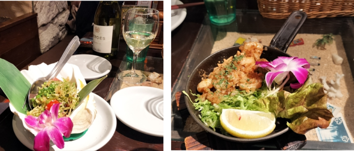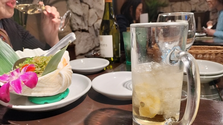 濃いめハイボールを飲んでいると律子さんが登場しました。白ワインボトル、ポキサラダ、ガーリックシュリンプ、アンチョビ味のポテトフライをとりあえず注文しました。