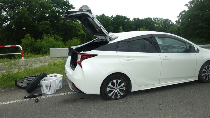 とても親切なJAFのお兄さんが「最近の車はスペアタイヤを搭載していない。プリウスは初期オプションでスペアタイヤ購入が必要」と教えてくれました。この車は最上位グレードだしオプション搭載してくれた新車購入者に感謝・・・