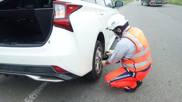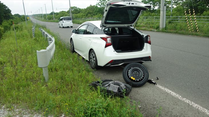 11時39分、苫小牧フェリー乗り場の約15km手前で運転席側の後輪がパンクしました。車を路肩に止め自分で修理しようと思いましたが、追突による大事故の可能性もあり、安全を考えJAFに電話しました。
