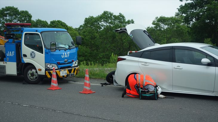 事故発生場所の説明が難しく、たまたま橋を渡り終えたところだったので橋の名前で場所解決。すると約15分程度でJAFが駆け付けスペアタイヤと交換してくれました。約30分で動けるようになり大正解、修理代金は0円でした。
