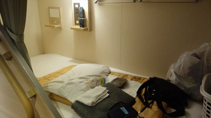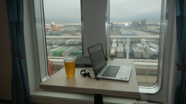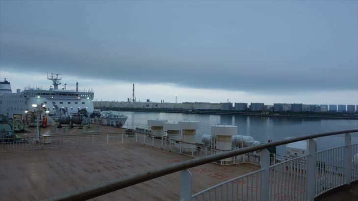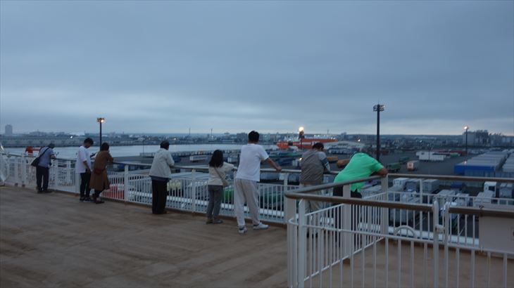 17時30分ころ乗船、今回のカプセルホテルは2階です。出航前のデッキで黄昏ている方々、離岸する瞬間など船旅の基礎を体験できました。