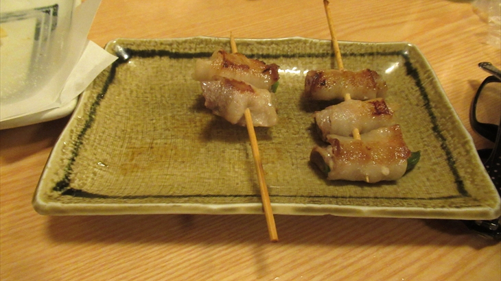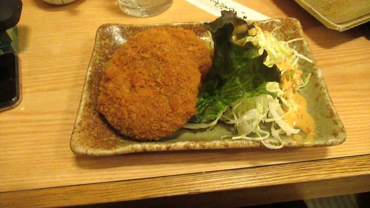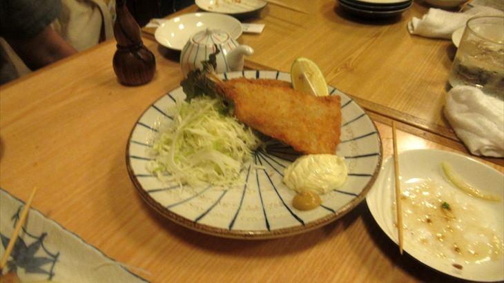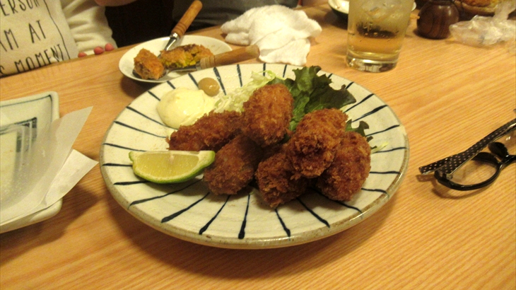 皆揃ってから、冷しゃぶサラダ・アスパラ肉巻き・豚バラ串焼き・かぼちゃコロッケ・メンチカツ・カキフライ・サーモンのお刺身・アジフライ・五目釜めしを注文。
