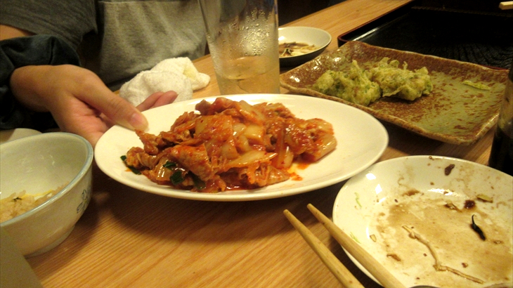 五目釜めしが出来上がった後、チクワの磯部揚げと豚キムチを注文、本日は揚げ物のオンパレードです。