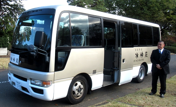 お食事会を予約した深大寺の水神苑からの送迎バスはすでに到着。多磨霊園から深大寺までは約15分くらいでした。水神苑は法事のお客様だけではなく七五三のお祝いの方もいて22組の予約で賑わっていました。