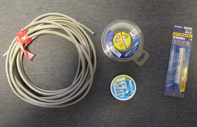 早速、ホームセンターへ行き必要とおもわれる工事部材を買いにいきました。購入したのはハンダ、熱収縮チューブ、絶縁テープ、電源ケーブルです。全部で1000円位かな・・・