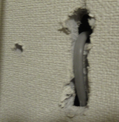 電源ケーブルの太さの方が石膏ボードの厚みより小さいので、上側の穴から壁裏の電源ケーブルを外に出し、補強版部分は石膏ボードの厚みの中に電顕ケーブルを収納、下側の穴から電源ケーブルを壁裏に通して、どうにか床面近くの電源コンセント付近までの通線作業が完了しました。