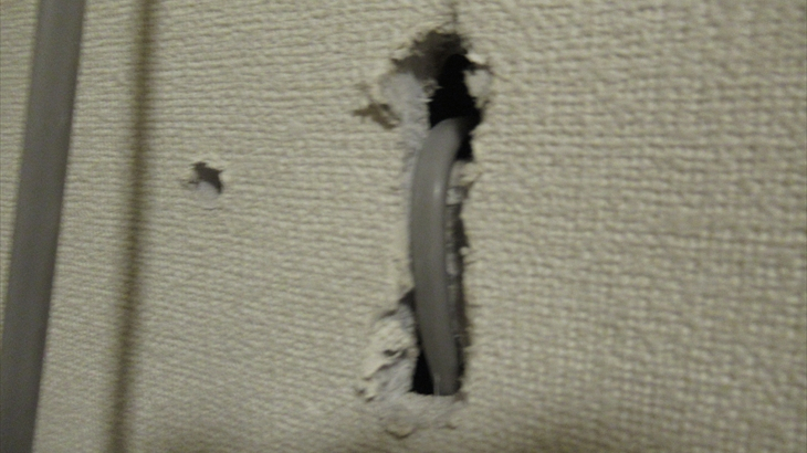 2階の既存インターフォンを取り外し電源コンセントまで購入した電源ケーブルを壁裏通線しようとしたところ、真ん中付近に補強板があり途中までしか通りません。