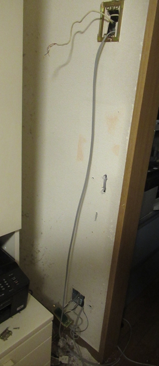 単線電源ケーブルの材料は1階のインターフォンの電源ケーブルから調達すべく切断しようとした瞬間、バチ~~!ブレーカを落とさず作業していたのでもう少しで感電するところでした。怖かった・・・・